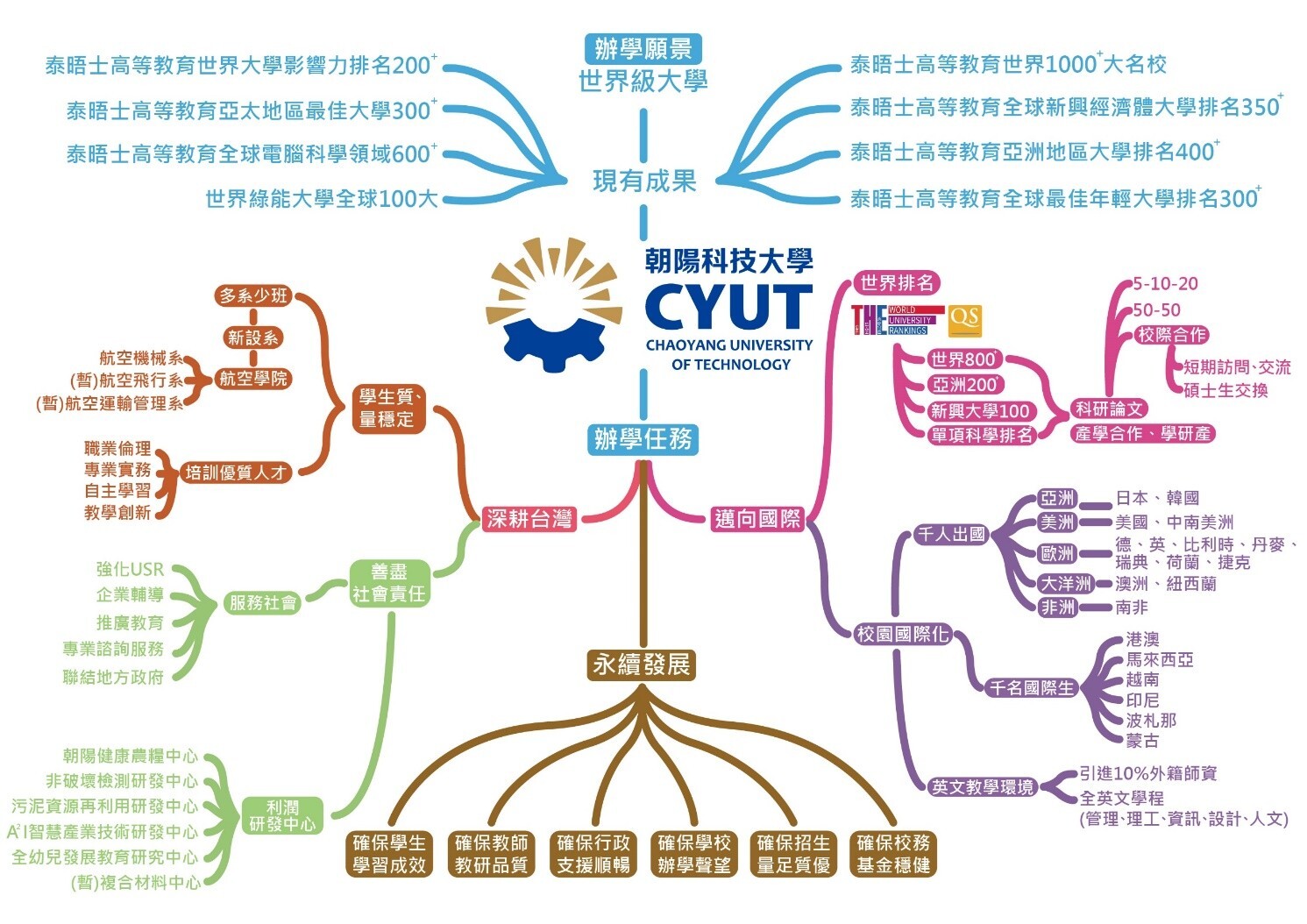 本校自1994年創校以來,即秉持「勤學、敦品、力行」之校訓,以培養專業知能與職業倫理兼備的優質人才,達成「畢業即就業,上班即上手」的教育目標,塑造本校成為「深耕台灣、邁向國際、永續發展」的優質學府。本校一路走來,在董事會與全體師生努力之下,榮登英國泰晤士高等教育(Times Higher Education, THE)全球最佳大學排名1000+大,並締造了許多辦學特色。為落實本校發展策略,實現宏觀願景,達成辦學使命,因此規劃本校辦學藍圖(如圖1所示),明確釐定「深耕台灣、邁向國際、永續發展」三大辦學任務,本校各單位之中長程發展計畫亦以此辦學藍圖為根基,具體規劃配合之行動方案與配置資源,落實執行。
