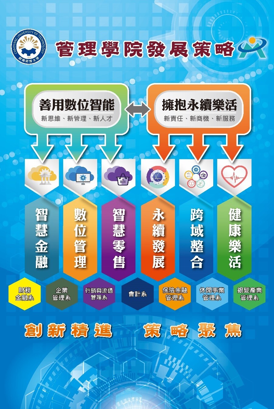 為呼應政府「高教深耕」教育政策,承襲「以學研產為導向的應用型大學」學校定位,落實六大育才策略與十大行動方案,本院根據產業高智能化與社會高齡化趨勢進行前瞻布局,經盤點管院辦學特色與各系資源,以「善用數位智能」與「擁抱永續樂活」兩大區塊,做為本院114-120學年度中長程計畫的發展主軸,如圖2所示,引領管院未來發展方向。藉由「善用數位智能」,創造新思維、新管理、新人才;藉由「擁抱永續樂活」,建立新責任、新商機、新服務。期望透過全院師生共同努力,再創朝陽科技大學管理學院的榮景與價值。